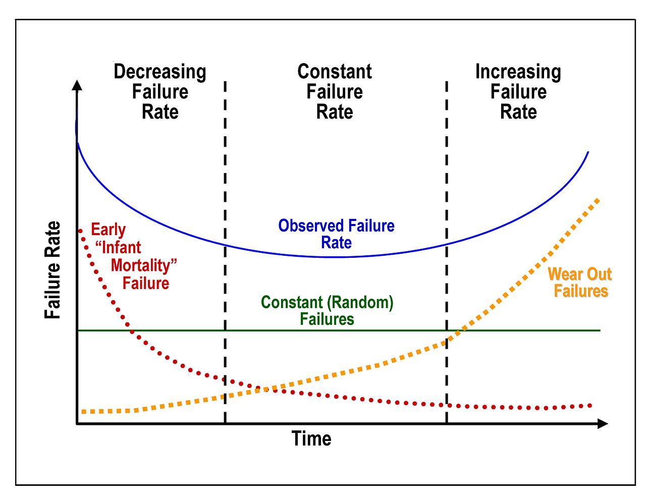 上記の図は「故障率曲線」と呼ばれるものです。 ハードウェアを使用すればするほど故障率が上昇していることを表しています。 縦軸が故障率、横軸が時間を表しているのですが、時間が経てばたつほど、故障率(Failure Rate)が上昇していることが分かります。